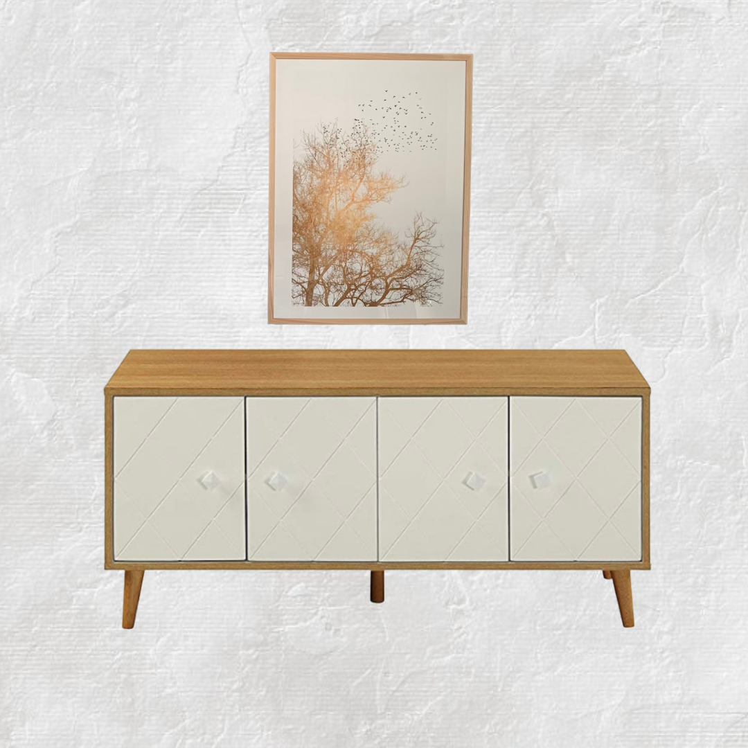 When I first saw this print, I immediately knew I wanted to pair it with a sideboard piece. I searched for one that matched the colors of this print, white doors and a natural color frame would be perfect. I didn’t want to pair it with a darker piece, I wanted this space to be full of neutral colors to mimic the look of the artwork.